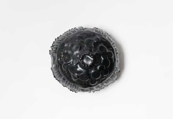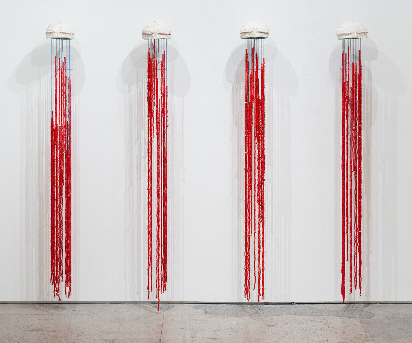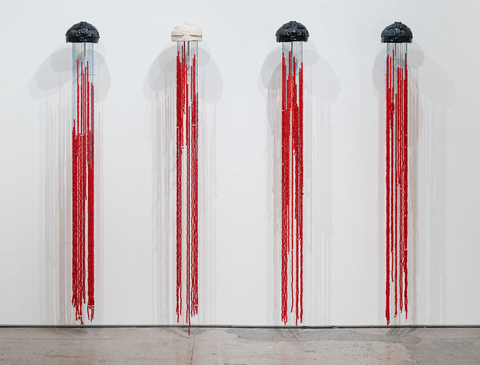 Another highlight at the Armory Show will be a new work from her ongoing minion sculpture series, consisting of slip-cast ceramic dance caps adorned with meticulously strung (Indigo-dyed cotton) strands of red, luminous glass beads, abalone (commonly seen throughout Indigenous regalia), and found buttons. Through this series, Siestreem ruminates about social justice, specifically as related to gender equality and women’s rights. She sees these works as protectors that simultaneously uplift the good and punish the bad.